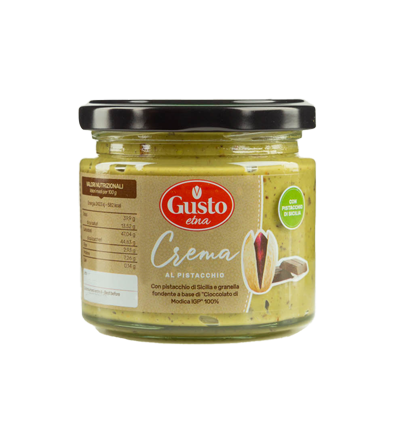 Gusto Etna pistāciju krēms ir gatavots no Sicīlijas pistācijām, kam pievienoti tumšie Modica IGP šokolādes kraukšķi. Šis gardais krēms ir lieliski piemērots brokastīm vai uzkodām, uzsmērēts uz cepumiem, kruasāniem, jogurta un svaigiem augļiem. Tas ir arī lielisks papildinājums svētku gardumiem, piemēram, panetone Ziemassvētkos vai baložu kūkai Lieldienās, un ir ideāls pankūku pildījumam.